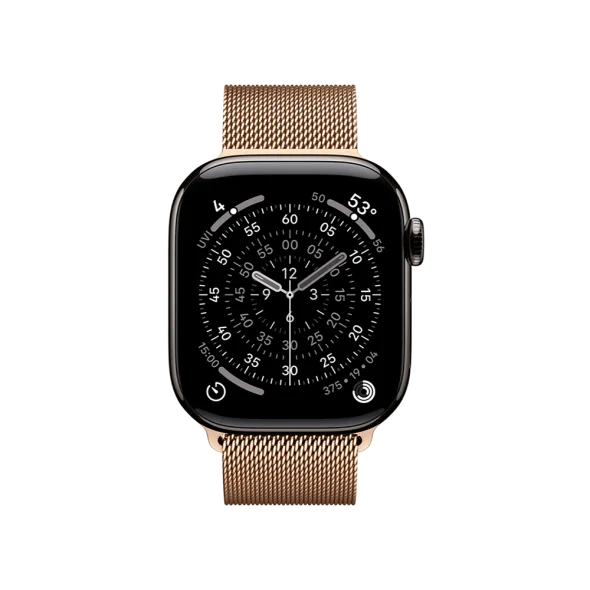 Смарт-годинник Apple Watch Series 11 GPS + Cellular 42mm Slate Tit. Case w. Gold Milanese Loop (MF9K4+MGJ04) має титановий корпус Slate, браслет Gold Milanese Loop і підтримку зв’язку без iPhone.