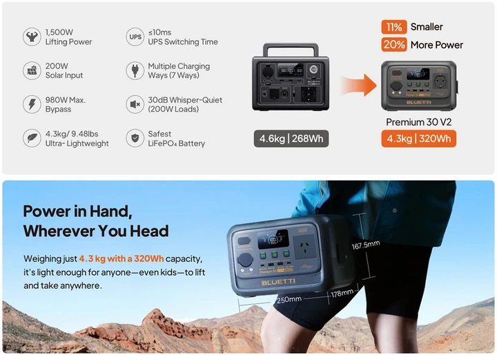 Зарядна станція BLUETTI Premium 30 V2 — компактне та потужне джерело енергії для дому, подорожей та активного відпочинку. З ємністю 320 Вт⋅год і номінальною потужністю 600 Вт ця станція забезпечить живленням усю вашу техніку. Швидка зарядка до 80% за 45 хвилин і наддовгий термін служби завдяки LiFePO4-акумулятору роблять її ідеальним рішенням для будь-яких потреб.